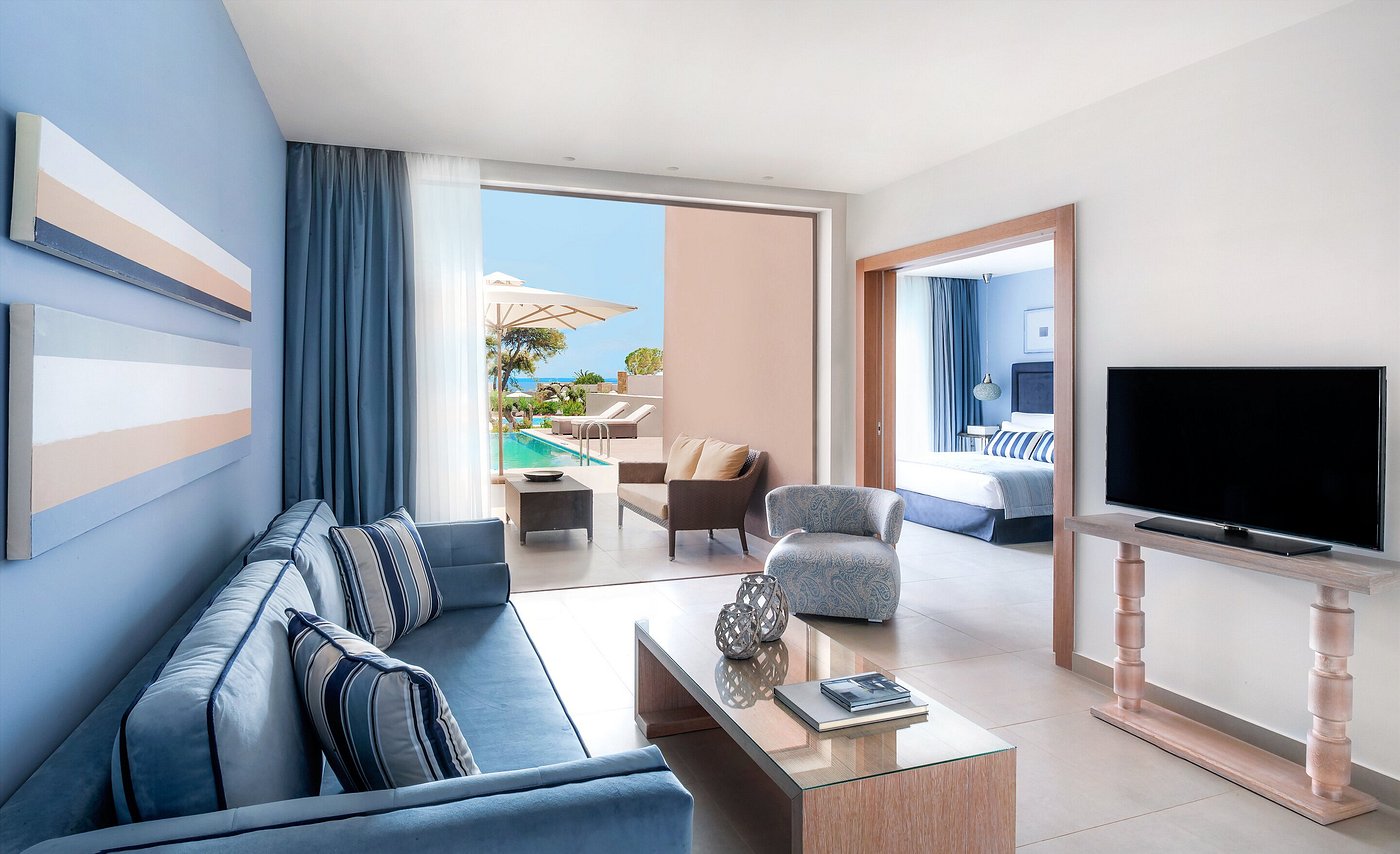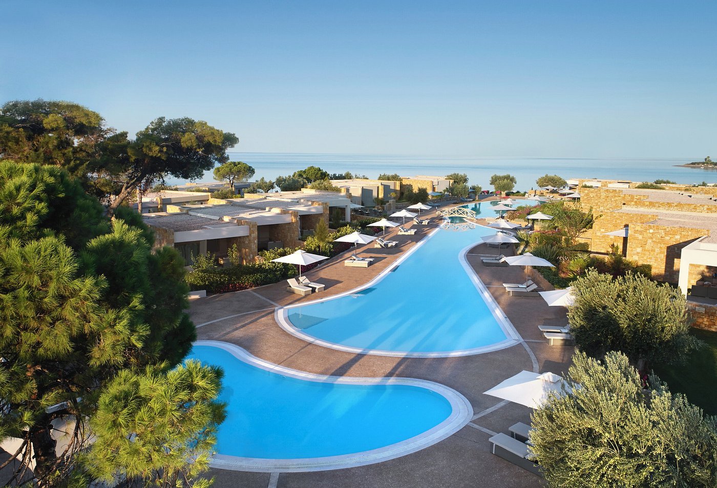 Set within 22 acres of fragrant olive groves along the Gulf of Toroneos, Ikos Olivia unfurls onto a 450-meter stretch of Blue Flag sand on the Sithonia peninsula of Halkidiki, an hour's transfer from Thessaloniki airport. A 2022 reimagining traded glossy resort sheen for something quieter and more assured, with soft mocha and ivory palettes, natural textures, and four distinct pool zones scattered across the grounds. Families settle into a range of contemporary rooms, junior suites, and garden bungalows, with a standout tier of one and two bedroom bungalow suites, several with private pools, that sleep up to six and suit multi-generational trips beautifully. The Deluxe Collection adds a layer of privacy with its own pool, beach section, concierge team, and a complimentary Tesla for a day's exploration of the peninsula's Byzantine villages and hidden coves.